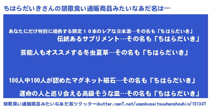 | ヘコむあだ名 | 『酢こんぶ』『ちはっ子』『ちはもー』 |