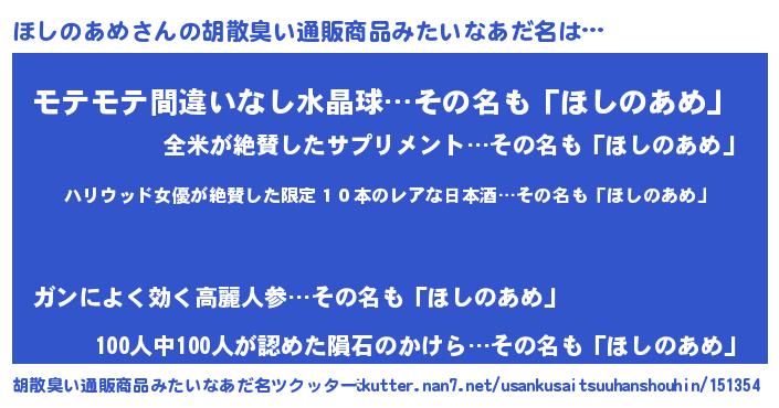 | 男性向けラノベタイトル風あだ名 | 『緋弾のホシノアメ』『ほしのあめの憂鬱』 |