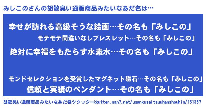| 意味不明あだ名 | 『永久保存みしこの』『ペロリンみしこの』 |