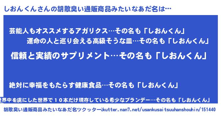 | ヘコむあだ名 | 『しおを』『酢こんぶ』『しおにゅー』 |