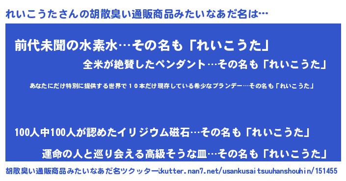 | 男性向けラノベタイトル風あだ名 | 『れいこうた~年齢イコール彼女いない歴の魔法使い~』 |