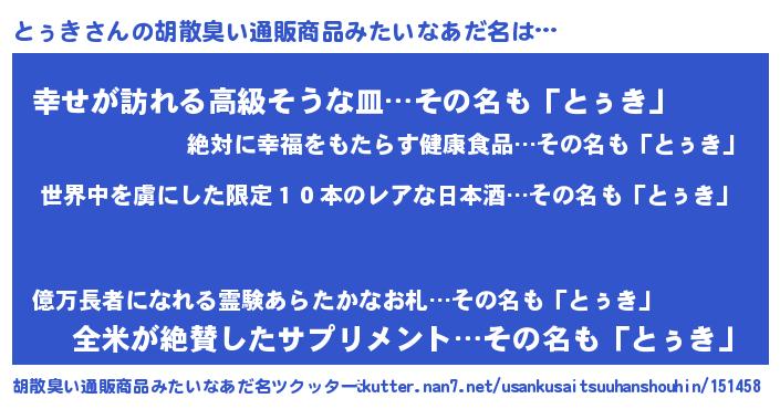 | 男性向けラノベタイトル風あだ名 | 『魔弾の王ととぅき』『とぅきの憂鬱』 |