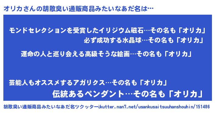 | 女子向けラノベタイトル風あだ名 | 『オリカの婚約者』『オリカ恋絵巻』 |