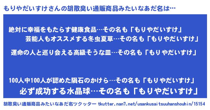 | 男性向けラノベタイトル風あだ名 | 『もりやだいすけに滅ぼされるだけの簡単なお仕事です』 |