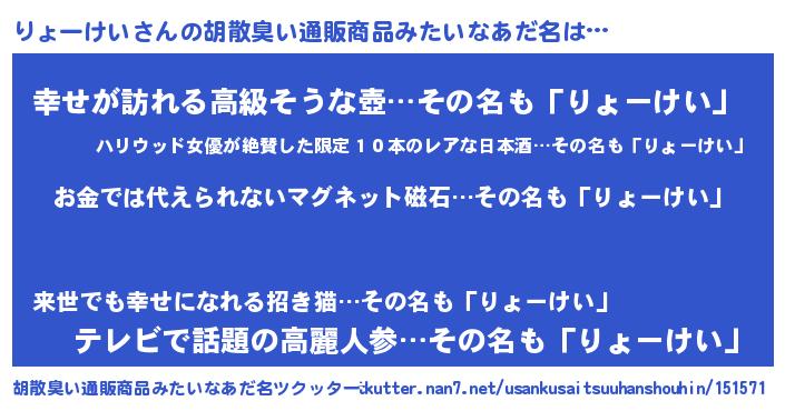 | ヘコむあだ名 | 『豆乳』『りょーけい(笑)』 |