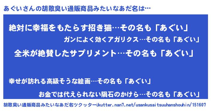 | 意味不明あだ名 | 『とにかく怪しいあぐい』『自称あぐい』 |