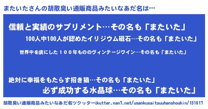 | 意味不明あだ名 | 『住所不定無職またいた(11歳)』 |