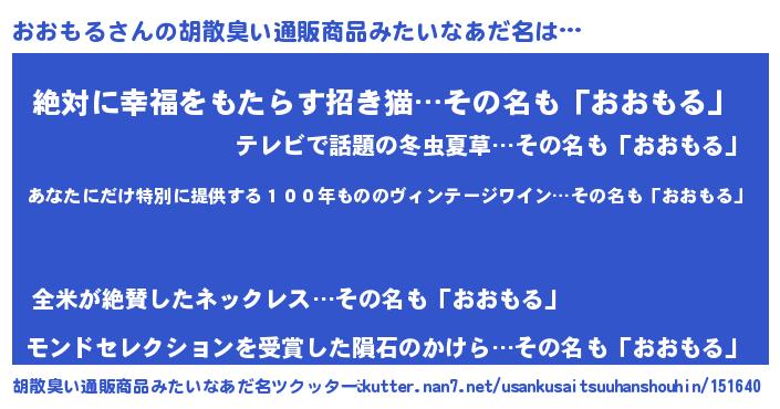 | 男性向けラノベタイトル風あだ名 | 『この素晴らしい世界におおもるを!』 |