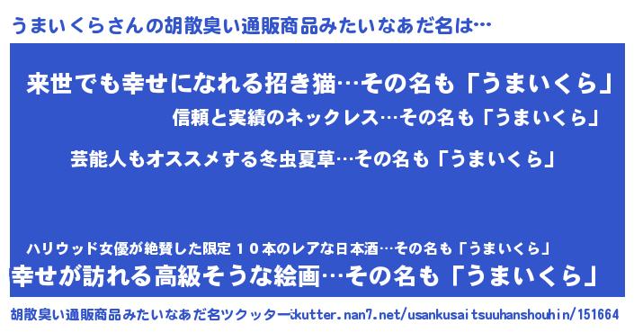 | 意味不明あだ名 | 『自称うまいくら』『永久保存うまいくら』 |