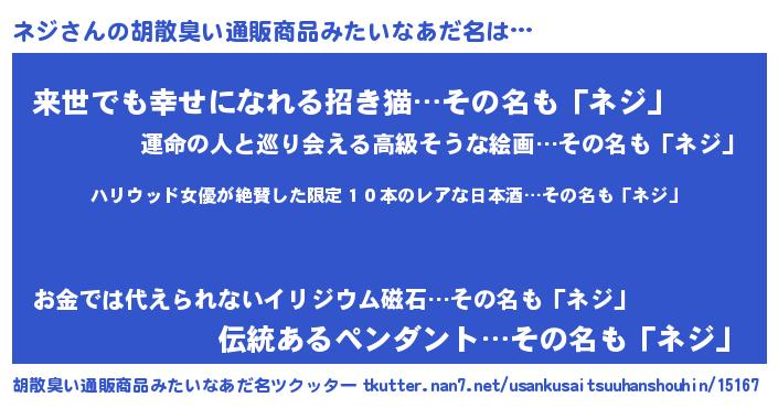 | 意味不明あだ名 | 『住所不定無職ネジ(62歳)』『永久保存ネジ』 |