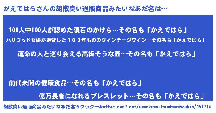 | ヘコむあだ名 | 『酢こんぶ』『かえにー』『かえ太郎』 |