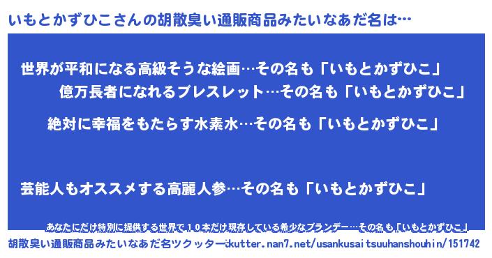| 男性向けラノベタイトル風あだ名 | 『いもとかずひこという概念が存在しない退屈な世界 』 |