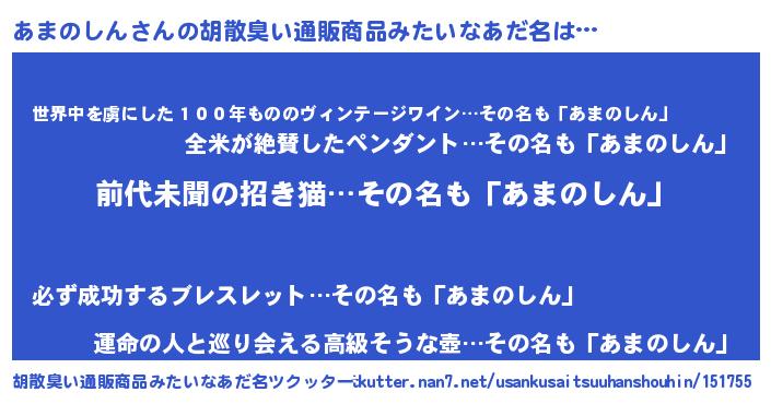 | 男性向けラノベタイトル風あだ名 | 『あまのしん~年齢イコール彼女いない歴の魔法使い~』 |