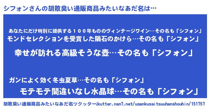| 男性向けラノベタイトル風あだ名 | 『やはりシフォンの青春ラブコメはまちがっている 』 |