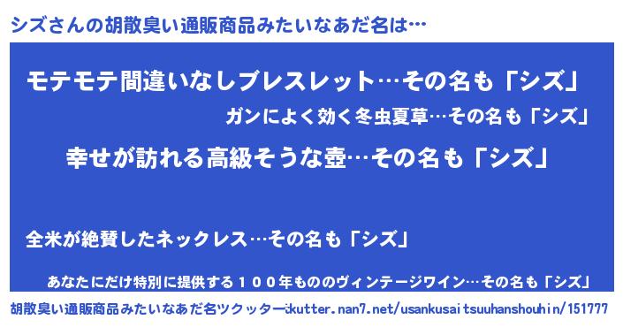 | 2回繰り返すあだ名 | 『シシズズ』『シズシズ』『わんわん』 |