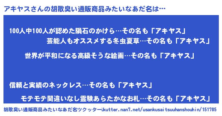 | 意味不明あだ名 | 『アキヤスフォーエバー』『自称アキヤス』 |