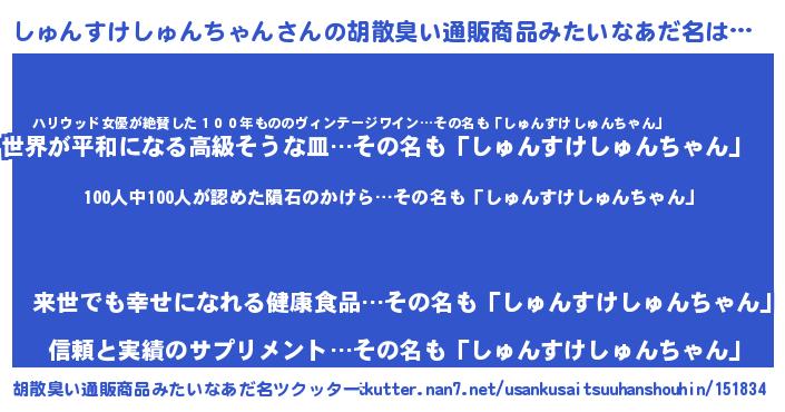 | 男性向けラノベタイトル風あだ名 | 『おまえをオタクにしてやるから、俺をしゅんすけしゅんちゃんにしてくれ! 』 |