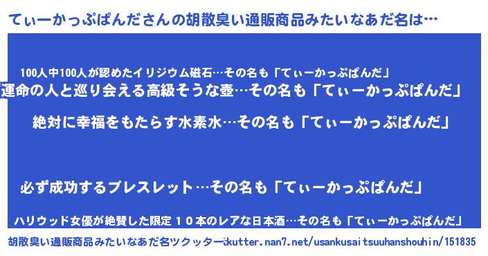 | 男性向けラノベタイトル風あだ名 | 『てぃーかっぷぱんだという概念が存在しない退屈な世界 』 |