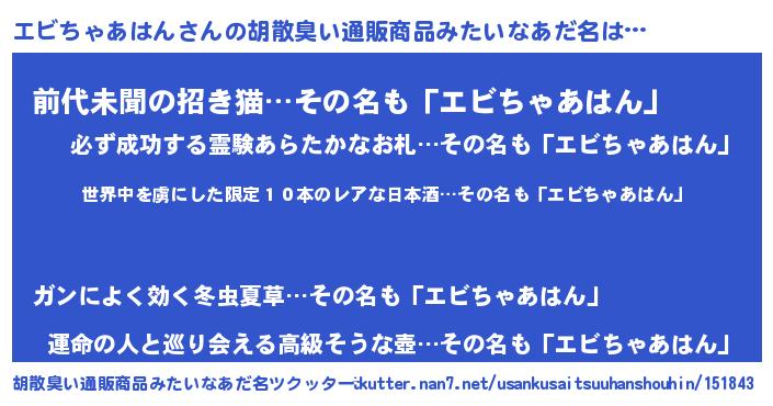 | 意味不明あだ名 | 『住所不定無職エビちゃあはん(65歳)』 |