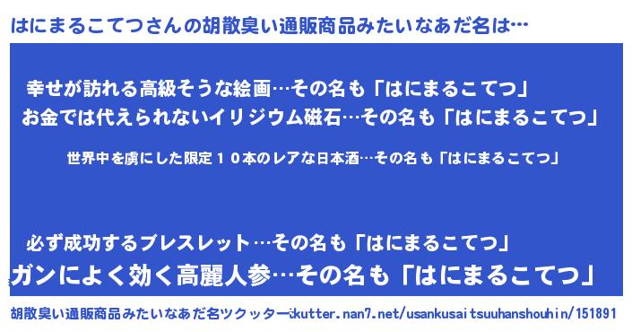 | 意味不明あだ名 | 『住所不定無職はにまるこてつ(47歳)』 |