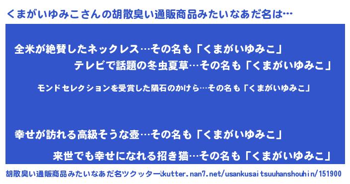 | ヘコむあだ名 | 『くまっぺ』『くまがいゆみこ(笑)』 |