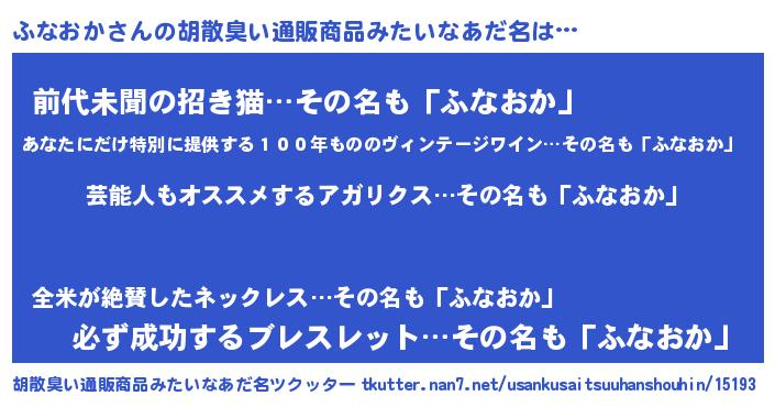 | 意味不明あだ名 | 『自称ふなおか』『永久保存ふなおか』 |