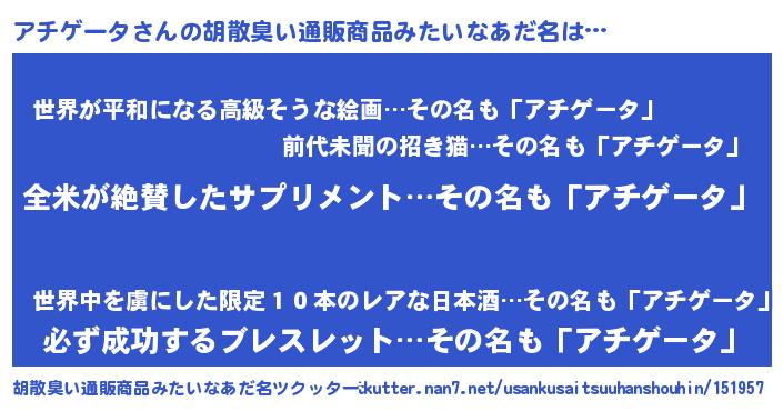 | 意味不明あだ名 | 『とにかく怪しいアチゲータ』 |