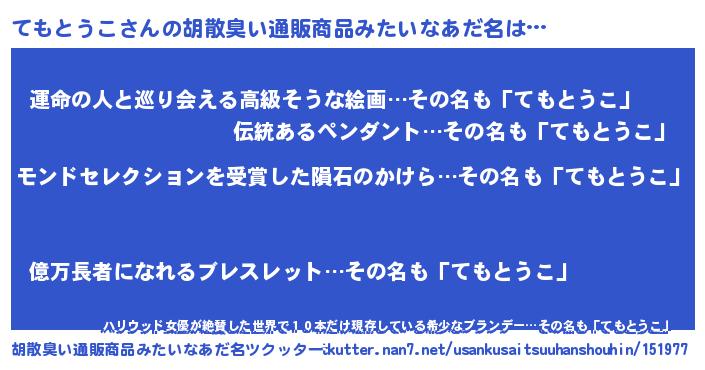 | 伝説のあだ名 | 『救世主となる錬金術士てもとうこ』 |