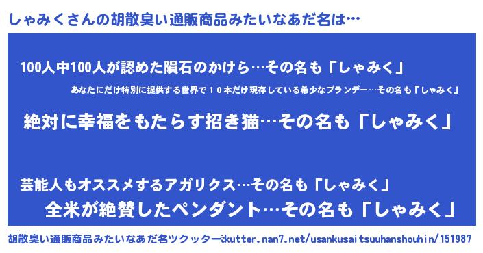 | 男性向けラノベタイトル風あだ名 | 『しゃみくという概念が存在しない退屈な世界 』 |