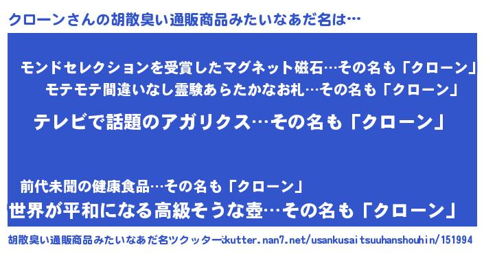 | 意味不明あだ名 | 『自称クローン』『ヨモギ科クローン属』 |