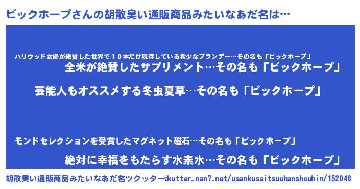 | ヘコむあだ名 | 『ビックホープ(震え声)』『ビッぷりん』 |