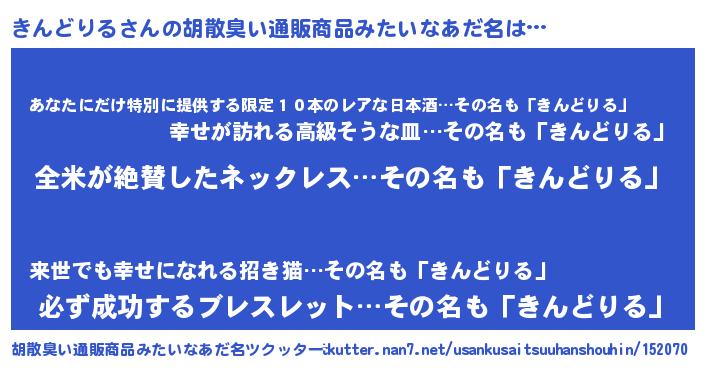 | 男性向けラノベタイトル風あだ名 | 『きんどりるの嫁は女の子じゃないと思った?』 |