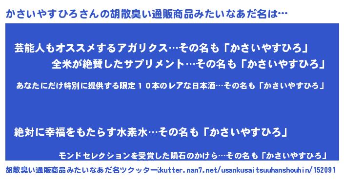 | 男性向けラノベタイトル風あだ名 | 『この素晴らしい世界にかさいやすひろを!』 |