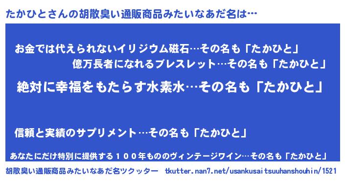 | 男性向けラノベタイトル風あだ名 | 『たかひとという概念が存在しない退屈な世界 』 |