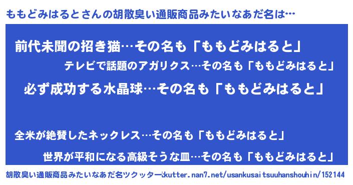 | 男性向けラノベタイトル風あだ名 | 『ももどみはるとの憂鬱』 |