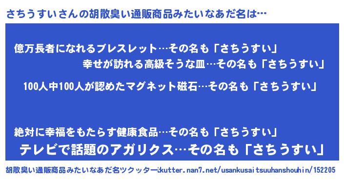 | 男性向けラノベタイトル風あだ名 | 『おまえをオタクにしてやるから、俺をさちうすいにしてくれ! 』 |
