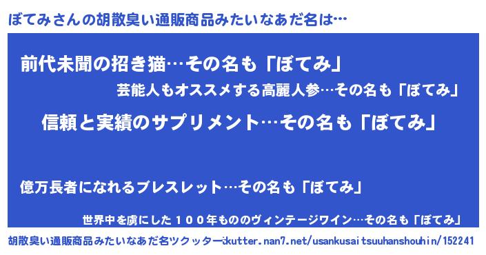 | 意味不明あだ名 | 『とにかく怪しいぼてみ』『自称ぼてみ』 |