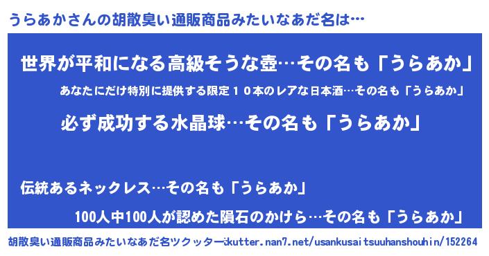 | 男性向けラノベタイトル風あだ名 | 『うらあかの憂鬱』『魔弾の王とうらあか』 |