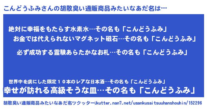 | ヘコむあだ名 | 『こんもー』『こんどうふみ(笑)』 |