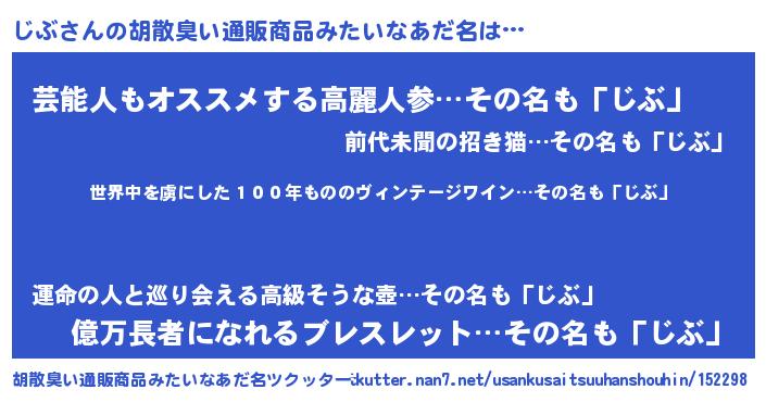 | 意味不明あだ名 | 『住所不定無職じぶ(4歳)』『自称じぶ』 |
