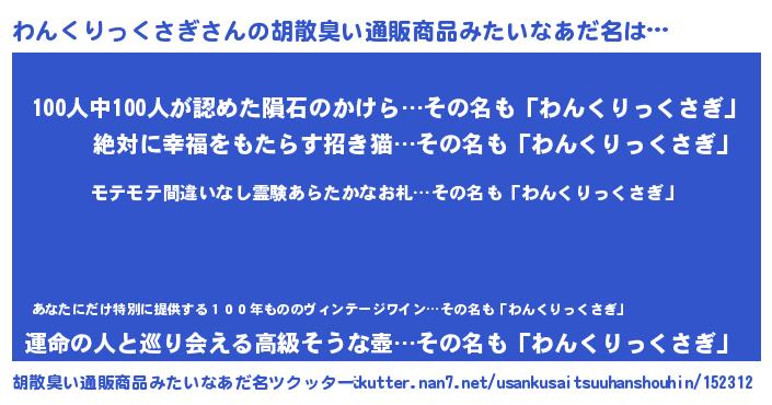 | 女子向けラノベタイトル風あだ名 | 『わんくりっくさぎ姫と円卓の騎士』 |