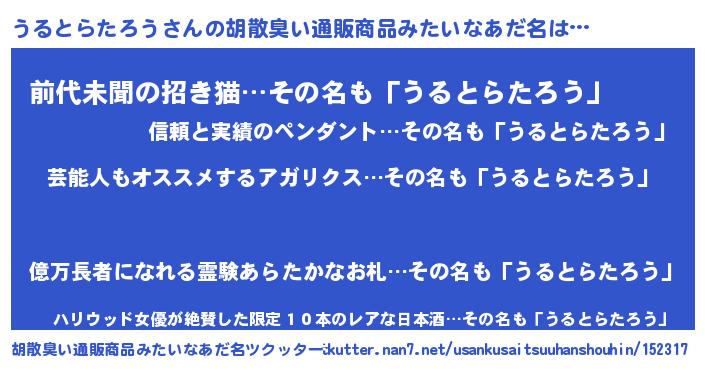 | 男性向けラノベタイトル風あだ名 | 『うちのうるとらたろうが世界を掌握している!』 |