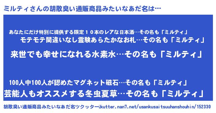 | ヘコむあだ名 | 『ミルティ(震え声)』『ミルにゅー』 |