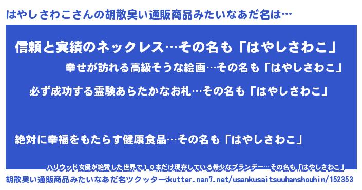 | 恥ずかしいあだ名 | 『プリティーはやしさわこ』『はやっちょ』 |