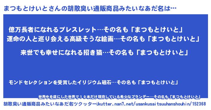 | ヘコむあだ名 | 『まつもとけいと(小並感)』『まつにー』 |