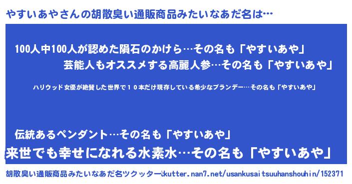 | 意味不明あだ名 | 『住所不定無職やすいあや(77歳)』 |