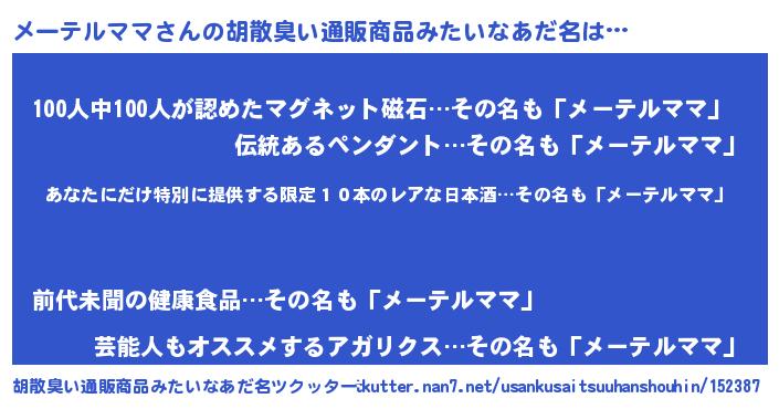 | 意味不明あだ名 | 『住所不定無職メーテルママ(14歳)』 |