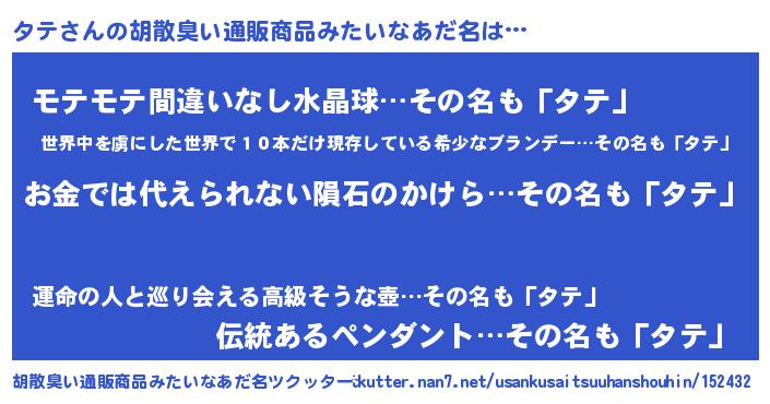 | 恥ずかしいあだ名 | 『ボンバーヘッドタテ』『プリティータテ』 |