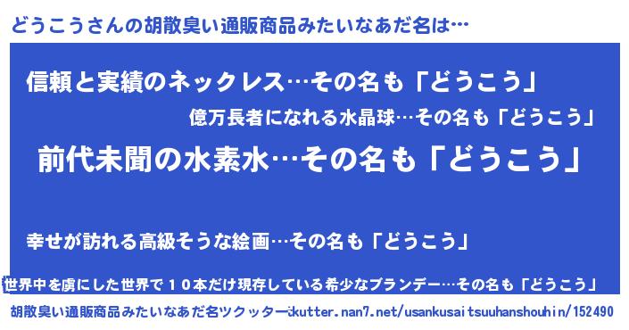 | 男性向けラノベタイトル風あだ名 | 『どうこう~年齢イコール彼女いない歴の魔法使い~』 |
