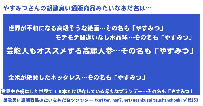 | 肩書あだ名 | 『やすみつ閣下』『やすみつ総理大臣』 |